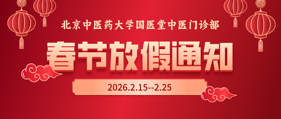 2026-01-21北京中医药大学国医堂春节放假通知北京中医药大学国医堂2026年春节假期为2月15日至2月25日, 2月26日正常门诊,请大家妥善安排就诊时间。 祝大家春节愉快 -